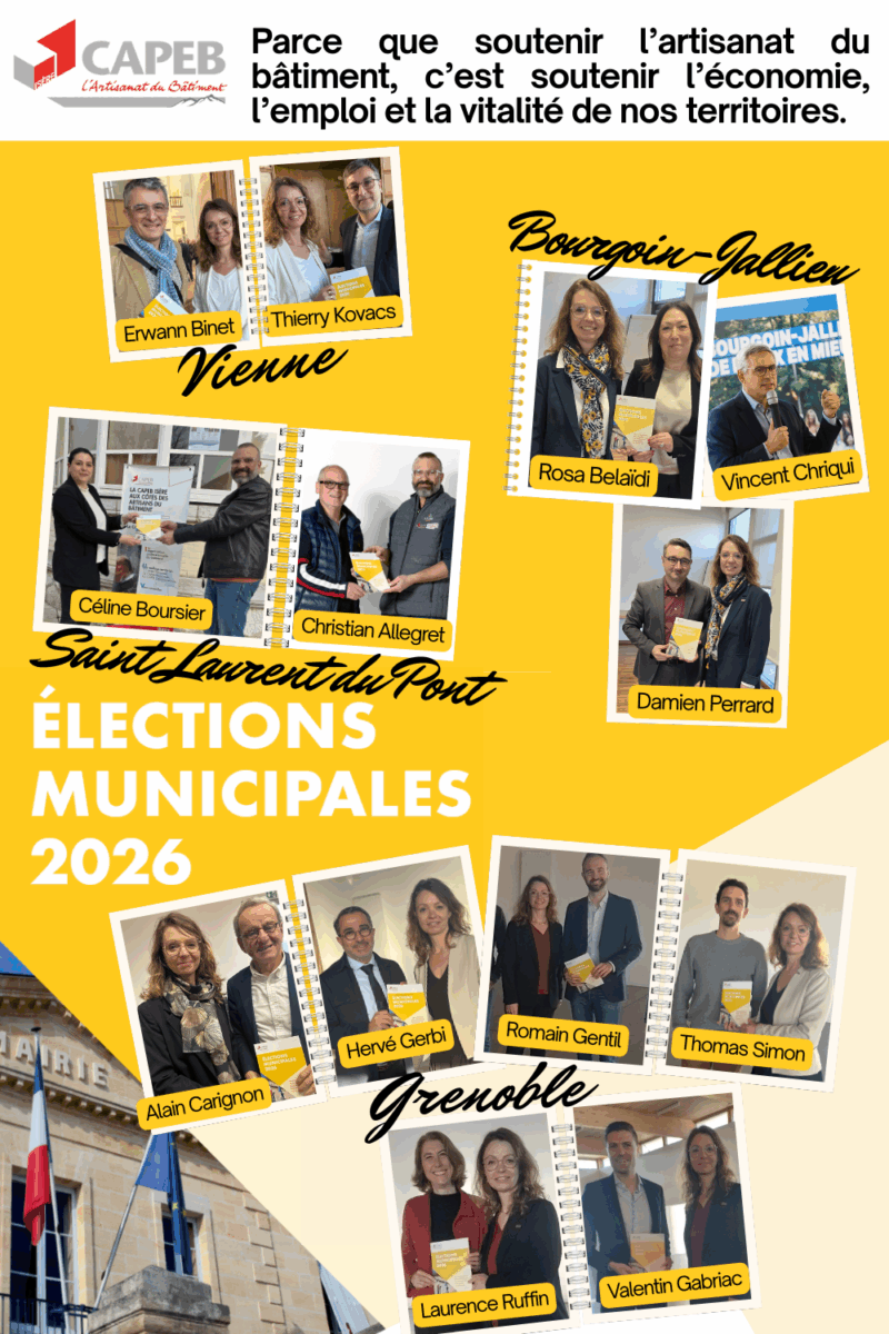 À l’approche des prochaines élections municipales, la CAPEB Isère s’est pleinement mobilisée afin de porter la voix des entreprises artisanales du bâtiment auprès des futurs élus locaux. Dans ce cadre, l’organisation a remis le manifeste national de la CAPEB à plusieurs candidats du territoire, afin de sensibiliser les équipes municipales aux enjeux concrets rencontrés par les artisans.