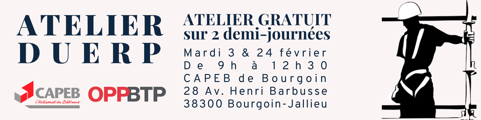 Capeb Bourgoin 28 avenue henri barbusse, Bourgoin-Jallieu, FranceLes mardi 3 et 24 février Pourquoi faire son DUERP ? Indispensable pour assurer la sécurité et la santé des collaborateurs, ce document permet au nouvel embauché de se familiariser avec son environnement de travail et acquérir les bonnes pratiques de sécurité avant la prise en poste. Il vise également à faire un inventaire de l’ensemble des risques qui existent ou peuvent subvenir dans l’entreprise en matière de santé et sécurité pour les salariés. Important : La présence du dirigeant de l’entreprise est fortement recommandée pour cet atelier. En participant, le dirigeant pourra mieux comprendre les obligations légales liées au DUERP, évaluer les risques spécifiques à son activité, et mettre en place des mesures adaptées pour garantir la sécurité de ses salariés. Cela permet également de développer une vision globale de la santé et de la sécurité au travail dans son entreprise, tout en favorisant une culture de prévention efficace. Inscrition ici