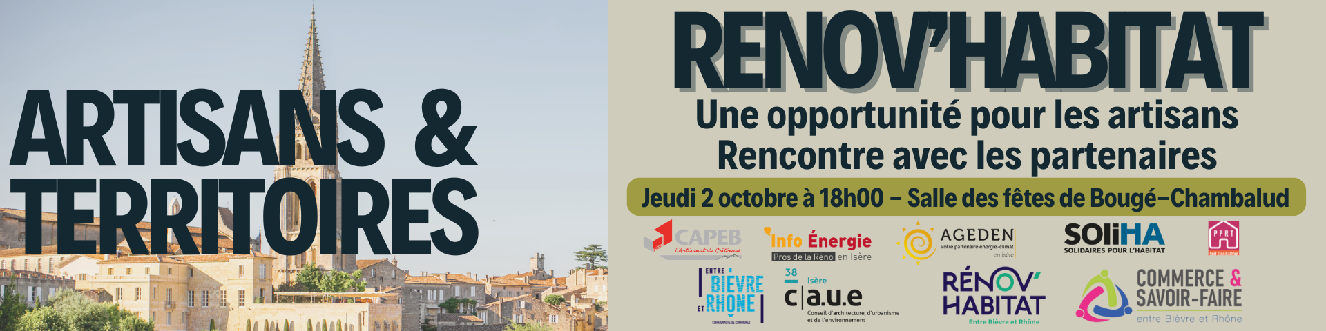 RENOV' HABITAT : une opportunité pour les artisans Rencontre avec partenaires Participez au débat du jeudi 2 octobre à Bougé-Chambalud : Un temps d’échanges autour du parcours de rénovation d’un bâti, depuis le constat de la nécessité de rénover jusqu’à la réussite du projet, dans le cadre du PACTE. Venez découvrir les regards croisés d’élus, d’organismes et d’artisans sur les enjeux techniques, financiers et humains de la rénovation. Jeudi 2 octobre à 18h00 Salle des fêtes de Bougé-Chambalud Inscription ici